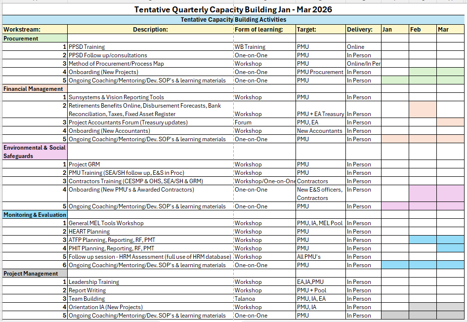 To provide capacity building based on project management, procurement, financial management, environmental & social safeguards, monitoring & evaluation and contract management and engineering needs of the WB Projects, specifically for: